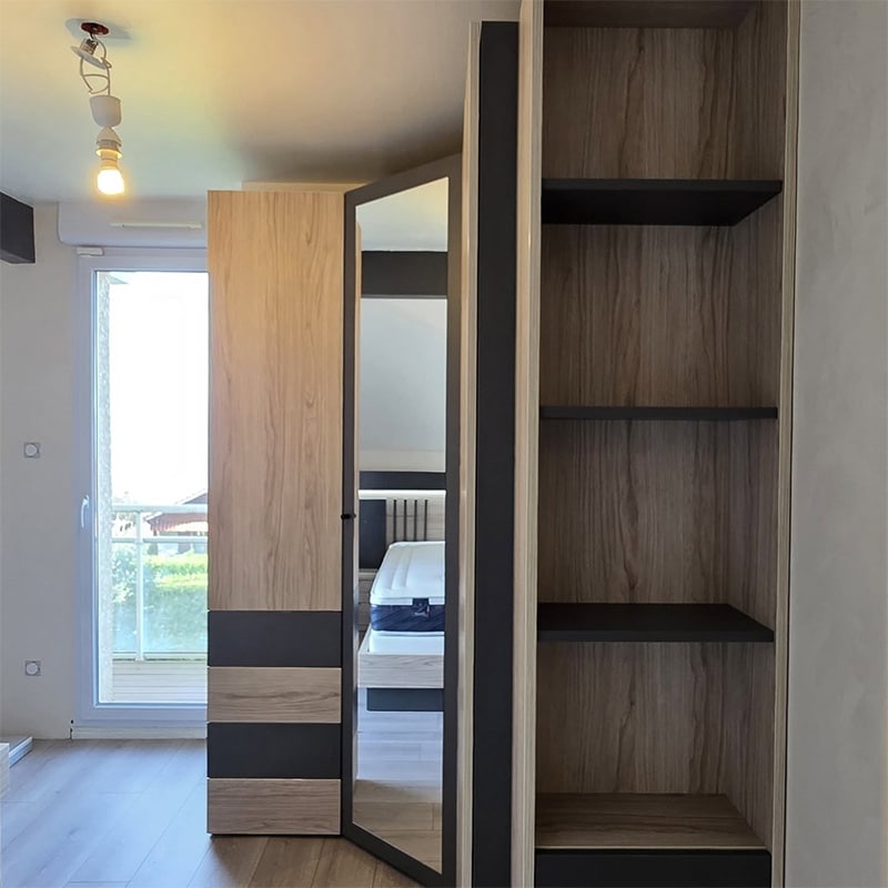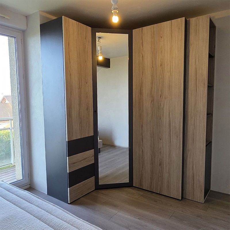 • Une armoire d’angle avec une porte miroir et deux penderies intégrées (une haute et une basse).