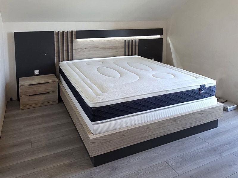 Un lit complet 160 × 200 incluant le cadre, le sommier, le matelas, deux chevets et une tête de lit, pour un confort optimal et un ensemble harmonieux.