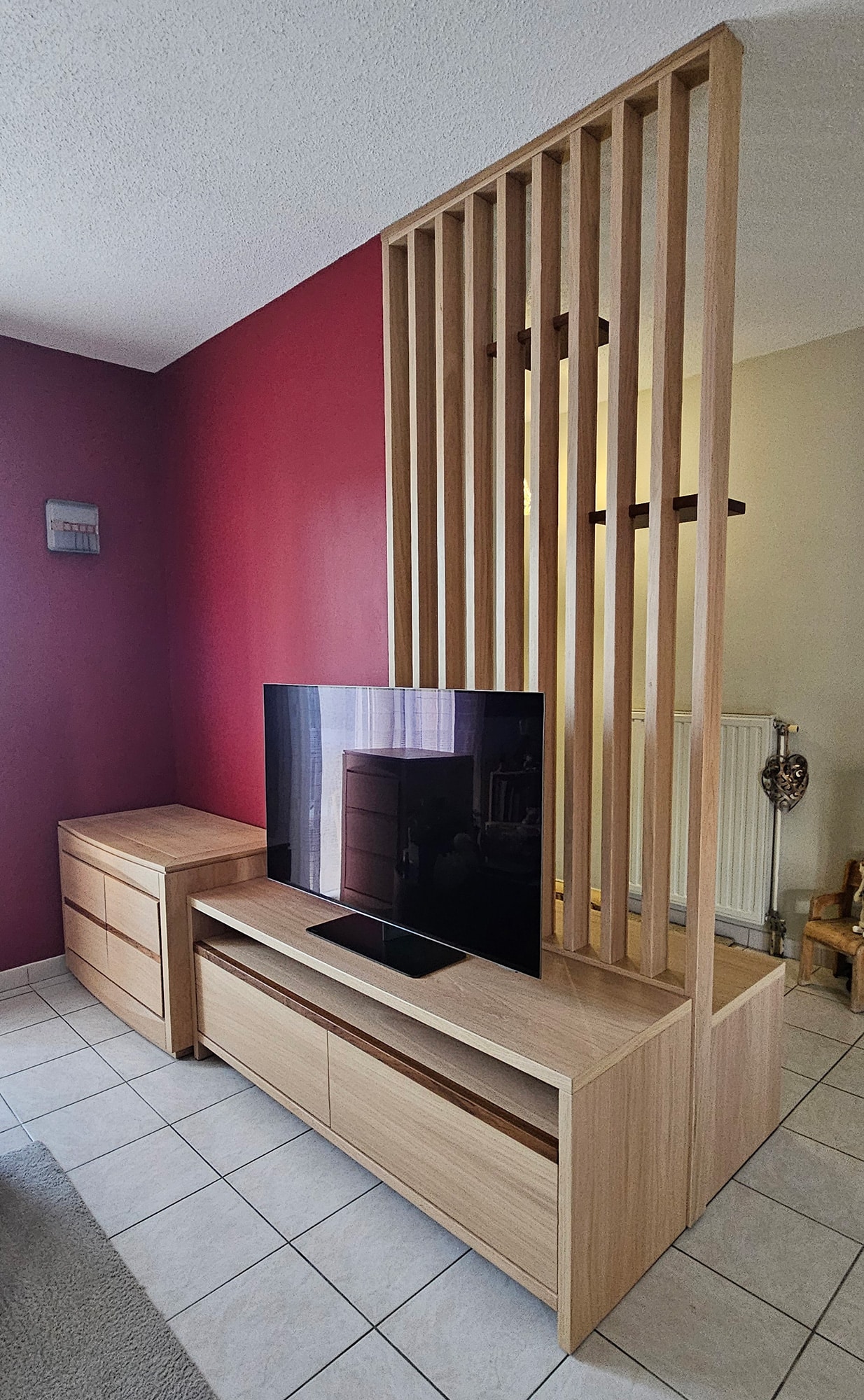 • Et côté salon d’avoir un meuble tv plus grand avec 2 tiroirs + 1 niche, tout en optimisant la lumière.