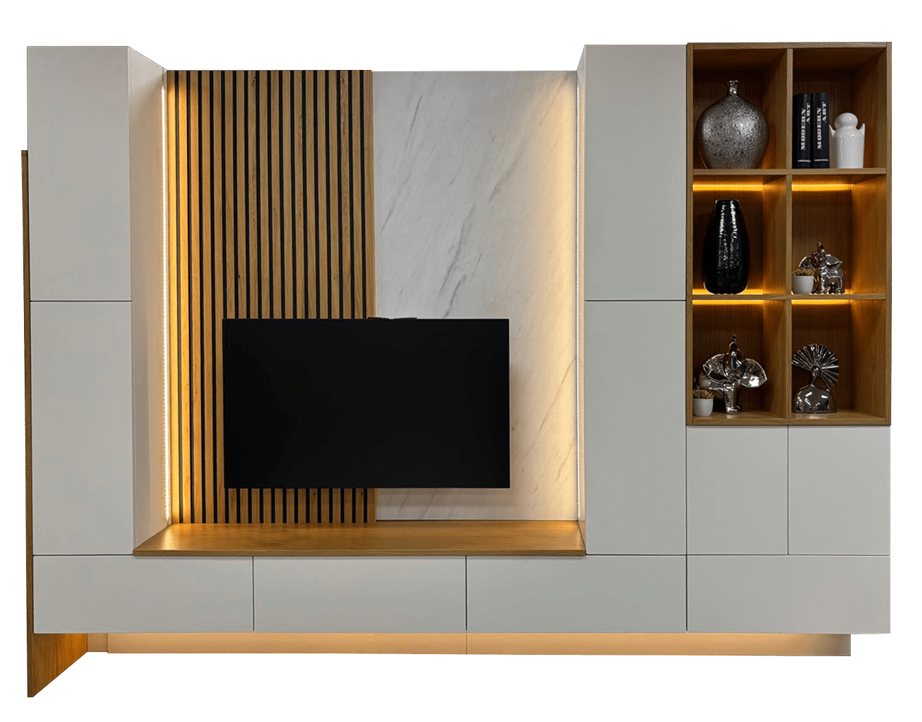 • 1 colonne 2 portes, 1 espace multi média avec panneau de chêne vertical 3D et éclairage latéral