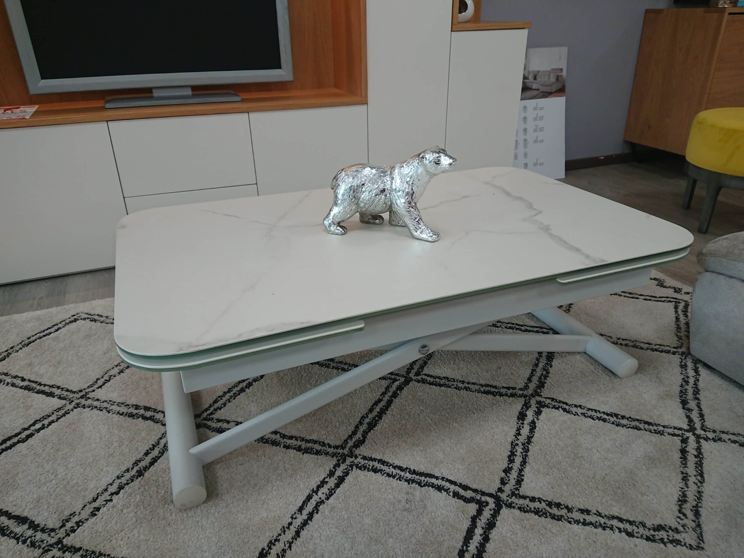 - La table de salon Réf. AURA relevable en hauteur permet un gain de place et transforme votre intérieur en un instant. En effet c’est avant tout une table basse qui se transforme en table de repas que vous pouvez régler en hauteur au millimètre près. La table est extensible avec 2 allonges intégrées en bout. Son plateau est en céramique avec plusieurs coloris au choix. Le piétement est laqué noir.