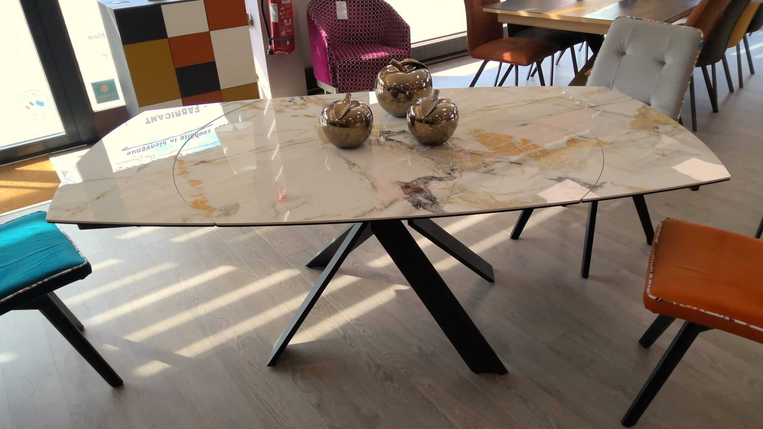 La table Réf. M pied central avec plateau et allonges céramiques ( plusieurs coloris au choix ) rétractables et synchronisés.