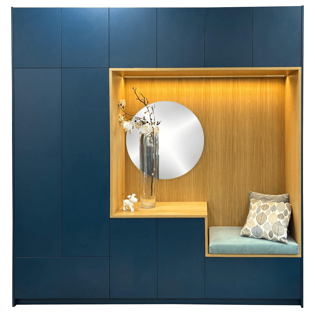 Agencement d’entrée Réf. B avec structure en stratifié coloris bleu océan avec niche en chêne finition brut mat.