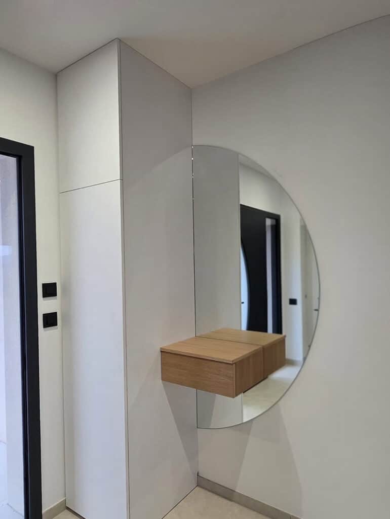 Le projet se prolonge dans le hall d’entrée avec un agencement fonctionnel et esthétique : une colonne de rangement, un miroir demi-cercle et un tiroir surplombant l’ensemble, pensé pour optimiser l’espace dès l’arrivée dans le logement.