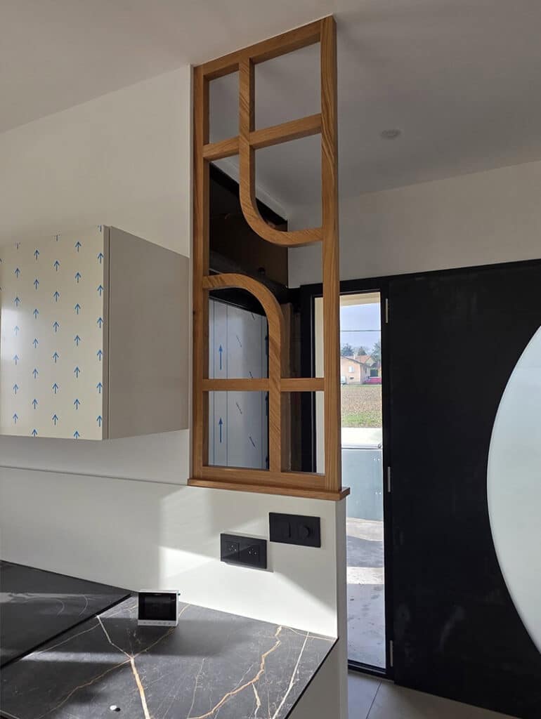 Pour structurer les volumes tout en conservant la transparence, un claustra sur mesure en chêne massif teinté naturel a été installé, renforçant le caractère architectural de la pièce.
