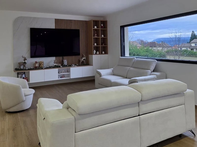 Enfin, le salon est complété par un mobilier confortable et élégant, composé d’un canapé 2 places électrique, d’un canapé 2 places fixe et d’un cabriolet, pour un espace de vie convivial et raffiné.