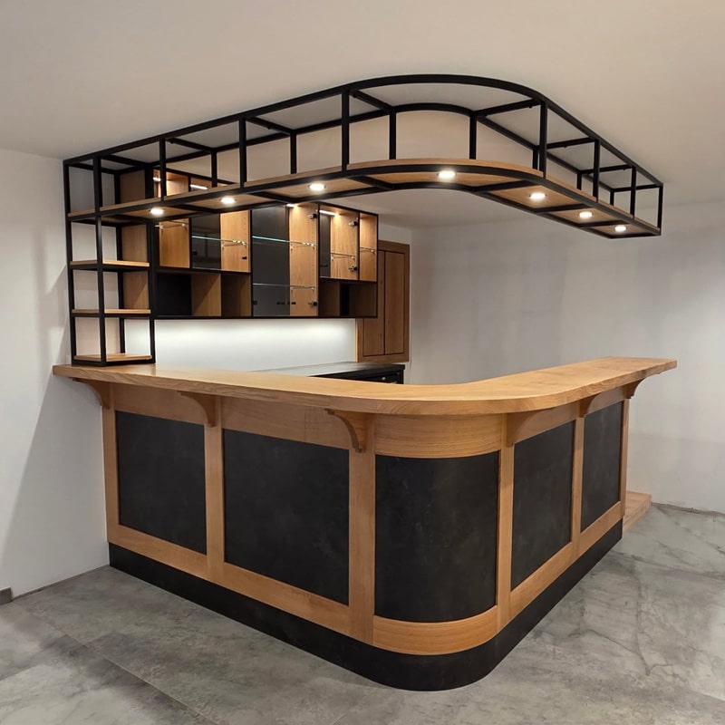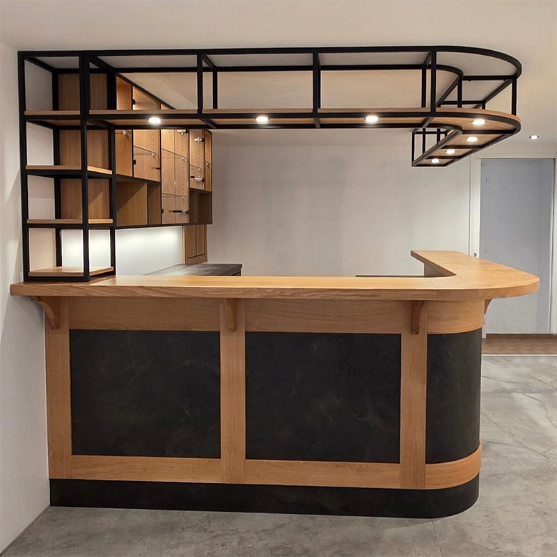 • Un bar central associant plateau et structure en chêne massif, et une façade habillée de panneaux décoratifs assortis au plan de travail arrière.